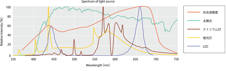 図1. 各種光源のスペクトルと光合成感度曲線