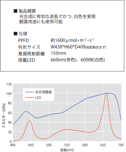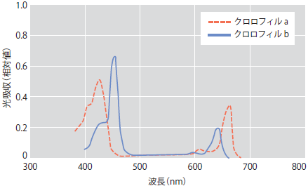 スペクトルについていえば、光合成を行うクロロフィル(葉緑素)が最も吸収する波長は、赤色(660nm)と青色(450nm付近)である。原理的には、この2波長だけで植物の育成は可能である。