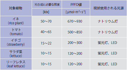 表1.作物の種類と必要な光量子束密度