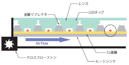 本実験機のLED照明部分について、断面概略を(図3)に示す。Cu基板上に、放熱を考慮し、COB(Chip On Board)方式でLEDチップを実装、その上に金属(アルミ)リフレクタと集光レンズを搭載している。Cu基板下部にはアルミ製ヒートシンクを装着、クロスフローファンによる冷却を行う構造となっている。また、Cu基板には、サーマルビア構造を採用した。実装部詳細を(図4)に示す。通常のメタル基板では、LED実装部とメタル基板間に70µm程度の絶縁層が存在し、これは熱伝導を悪くする要因となる。