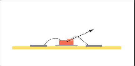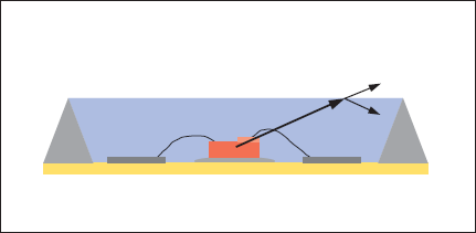SMD方式のLEDに用いられる一般的な封止方法である。一般用途としての白色LEDでは、樹脂の中に蛍光体を含ませているため、この構造でも問題ない。蛍光体によって励起された光は、拡散光としてさまざまな角度に放射されるからである。しかし、今回、植物育成に使用するLEDには660nmの赤色光、440nmの青色光など単色光を用いていることから、蛍光体を用いないフラット型樹脂封止を行っている。だが、次のような問題も存在する。