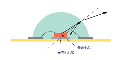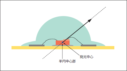 半球型樹脂封止は、(図7)のような半球状に封止することで、Type②のような「封止材-空気」間の全反射光を減少させ、光取り出し効率を高めることが可能である。しかし、この構造ではLEDチップの厚みにより、LEDチップの発光中心と半球中心にずれが生じることになる。(図7)これにより、LEDの発光中心から放出された光は、そのずれによって生じた入射角で「封止材-空気」の境界に進み、その一部は反射光に、残りは透過光として屈折しながら放射される。このときに反射光は反射や吸収を繰り返し、ロスを生じることになる。しかし、この半球型樹脂封止形状にすることで全放射強度は、実験によると、電流値100mAのときで、Type①やType②の構造をしたLEDと比較して、約35%アップさせることが可能である。(図9)