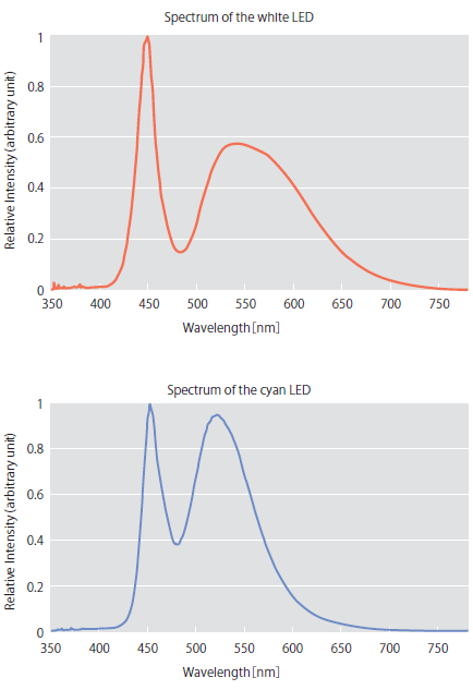 図1. White LED(上)とCyan LED(下)のスペクトルグラフ