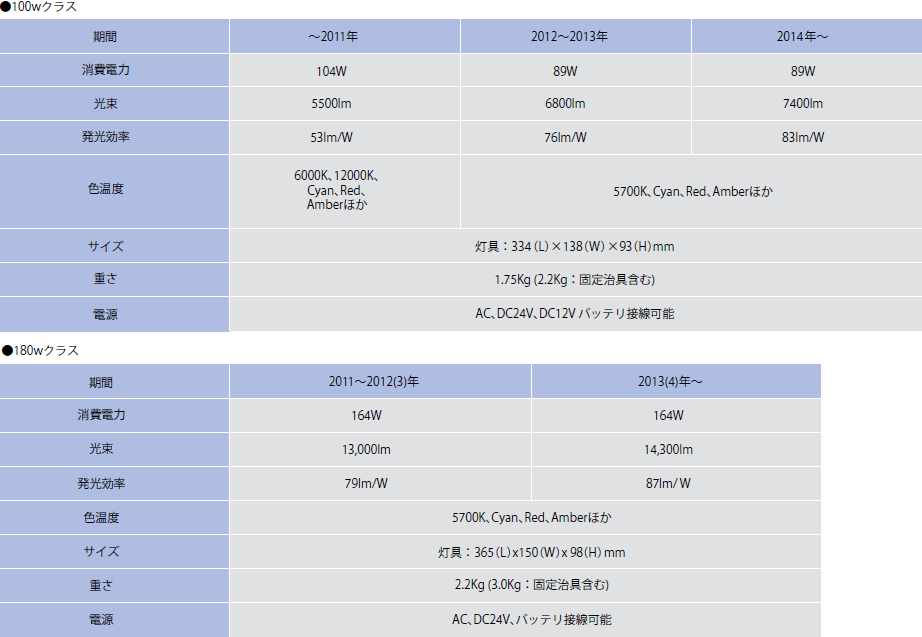 現在、販売しているLED集魚灯および開発計画中製品の主なスペックを以下にまとめた。発光効率は、2014年には100Wクラスで83lm/W、180Wクラスで87lm/Wとなる。