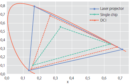 色域に関しては、ランプのブロードな可視域スペクトルから、カラーホイールを使用してRGBの各色を切り出すランプ方式と比較して、LEDやLDを使用する場合、RGB三原色が独立しており、また、スペクトルの幅が小さいことから、色域を広げることが可能となる。図1に示すように、レーザープロジェクターを使用することで、シングルチップを使用したランプ方式やDCI (Digital Cinema Initiative)規格よりも広い色域をカバーできることが分かる2)。
