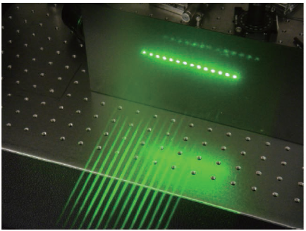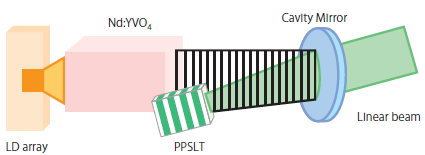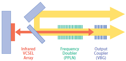 VCSELの基本波には、1064nmの赤外面発光レーザーを使用し、24個のマルチエミッターからガウシアン分布をしたレーザー光が発振される。基本波は、波長ロック用のVBGで構成されるミラーで反射され、LDアレイとの間で共振器を形成する。波長変換用のバルクPPLN結晶は、LDアレイとVBGの間に配置され、532nm緑色レーザーが得られる。図2に示すように、LDからの24本の光は、直接出射されるセットと、VBGで反射されPPLNを通過して波長変換され、2回45度折り返されたセットに分割され、合計48本のレーザー光がレーザーパッケージから出射される1)。