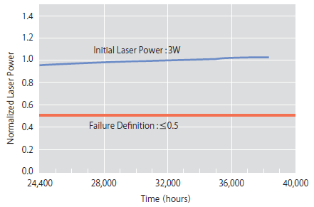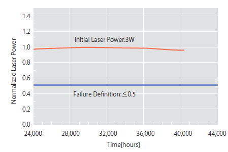 図4に、製品化されている緑色レーザーの外観写真を示す。仕様は、レーザー出力3W、電気-光変換効率6%を達成しており、デジタルシネマ等の高輝度用途にサンプル出荷を開始している。LD部の特性は、プロジェクター用に比較的高温での動作を可能にするため、35-40°C程度で最適化されており、また外部の温度変動による出力変動が最小限になるように、PPLN結晶の周期構造等も最適化されている。レーザー寿命については、VCSELの特徴を生かした自社開発技術により40,000時間を越える実測データを報告しており(図5)、CODが問題となる端面発光型レーザーと比較して、高い信頼性を確保していると言える。