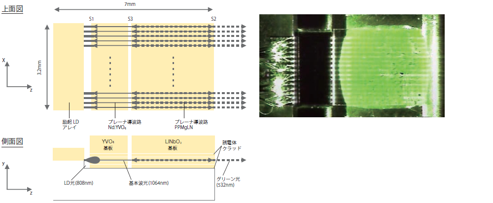 この他に、小型プロジェクター用の低出力緑色レーザー光源としては、Corning6)、OSRAM7)、Spectralus8)などが製品開発の実績がある。