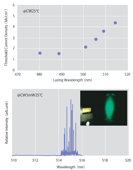 日亜化学は、2009年に、c面GaN基板上にMOCVD法にて作成したInGaNベース緑色LDを開発、図9(下図)に示すとおり、510-515nm波長域で、出力5mW(@25°C)を達成している2)。また2010年には50mW品を開発しサンプル出荷を開始しており、主に、ピコプロジェクター等の小型プロジェクターへの採用、製品化の加速が期待されている。