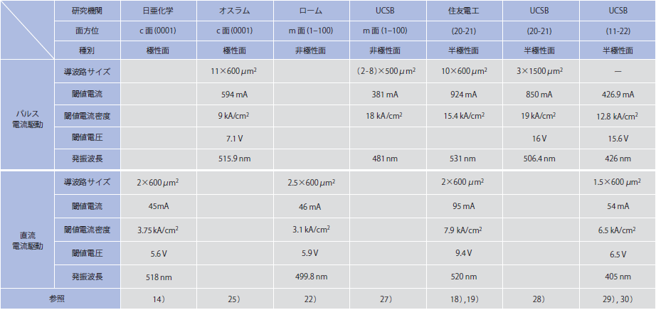 その他、OSRAMや住友電工などの企業でも同様の開発を行っており、現状をまとめると表1のとおりになる1)。
