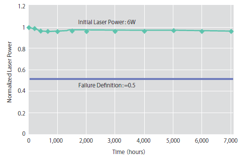 大型スクリーン用の高輝度プロジェクター用途に使用するには、数Wクラスのバータイプのマルチエミッターレーザーを複数個使用する必要がある。NECSELでは、高出力化に有利なエミッター幅の比較的大きい横マルチモードのエミッターを複数個並べたバータイプのLDをパッケージし、高輝度プロジェクター用途に製品化している。図11に示すように、FAC/SACコリメーションレンズを付けた赤色レーザーパッケージや、ファイバーカップリング用途にも製品化を行っている。前者で、CW光出力5W、効率25%を達成している1)。また、図12に示すように、Typ.5Wに対して、20%加入力時(6W)のライフテストにおいても、~7,000時間で明らかな劣化は起こっていない。