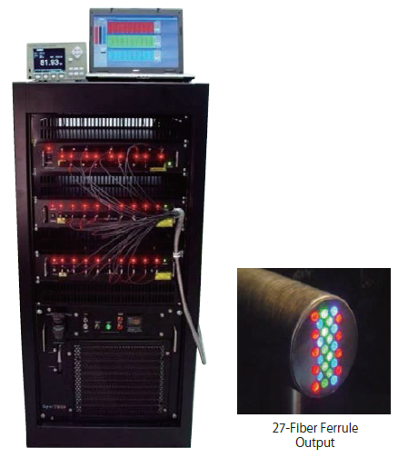図21に、NECSELが開発したレトロフィット式レーザープロジェクター用の光源モジュールの外観写真を示す1)。RGBレーザーを各9個ずつ使用し、ファイバー伝播方式を採用している。合計27本のファイバーをバンドルし、ファイバー先端を既存のプロジェクターの光学系に直接入射できる構造になっている。光源部、電源、冷却系、制御系を全て19インチラックに搭載している。
