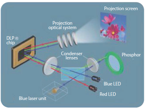 カシオは、2010年1月、世界初となる、従来の水銀ランプを使用しない、レーザーとLED、蛍光体を使用したHybrid光源を搭載したプロジェクターの販売を開始した1)。彼らの第1世代のHybridプロジェクターでは、青色光源として、青色LDを使用し、緑色光源には、青色LDで励起した緑色蛍光体からの発光を利用し、赤色には赤色LEDからの光を使用して、2,000-3,000lmの明るさを達成している。従来の光源と比較して、長寿命、広色域、水銀レスなどの特徴がある。さらに同社は、2011年11月、図29に示すように、新たに、青色光源として青色LEDを使用した次機種モデルの販売を開始した2)。