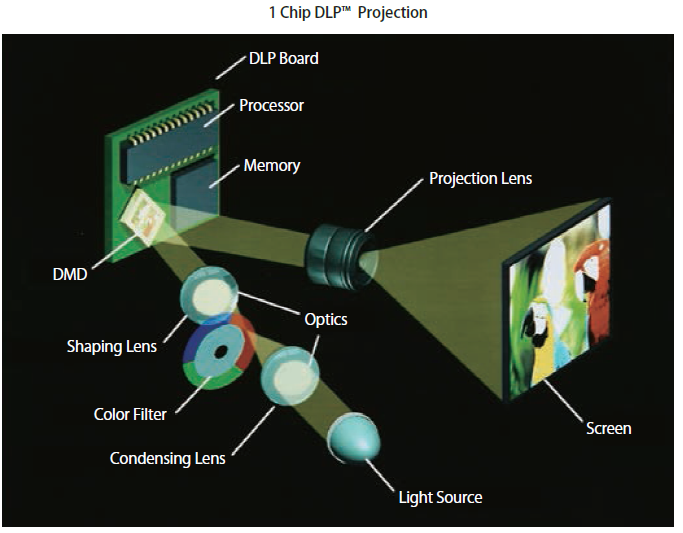 DLPは、TIの二次元反射型のMEMS素子であり、ミラーの反射でon/offを行う。光学系は、RGBを別々に空間変調する3板式と、一つの素子で行う単板式がある。図32に、現在主流である単板式DLPプロジェクターの構成図を示す。ランプからの白色光は、回転カラーフィルター(CF)でR、G、Bの三原色に分離されて、DMDチップに入射される。DMDチップで反射された光がプロジェクションレンズを通して、スクリーンへ投射される仕組みである。液晶のように偏光を用いないので色むらが無いのが特長である。また、液晶方式の様に色分離が必要でなく、プロジェクターの小型化に向くが、原理的に3板式と比較して単板式は1/3の光量となるため、高輝度化には向かない。また、CFの境界で色割れという問題が発生するため、CFの回転速度を上げて対応している。