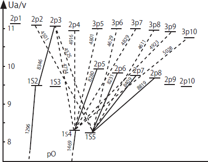 キセノンランプには、これ以外にも発光機構がある。放電により励起されたガスが、より低位の励起状態もしくは基底状態に遷移する際に、そのエネルギー差を光として放射する。これを線スペクトルという。キセノンガスの励起状態には様々なエネルギー準位があり(図3)、また遷移できる励起状態の組合せも様々である。そのため複数の線スペクトルが観察される。