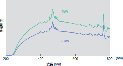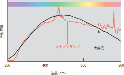 キセノンランプの分光スペクトルは、図2に示すように、可視光領域において太陽光の分光スペクトルに似ており、演色性がよいことは先に述べた。また図6に示すように、電気入力の変化に対して分布が一定であるため、非常に使いやすい。紫外域から赤外域までの連続スペクトルを持つこともキセノンランプの特徴であり、特に800~1000nmの近赤外部分に強いピーク波長があることから、熱源として利用されることも多い。