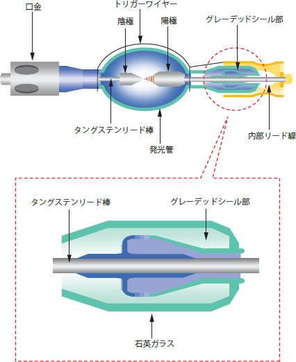 キセノンランプは、石英ガラスでできた発光管内に、キセノンガスと放電のための電極が封止された構造をとっている。(図5)