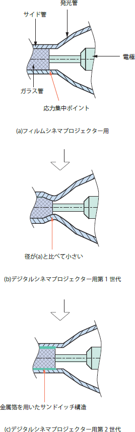 2000年頃のデジタルシネマプロジェクター用ランプでは、図7(b)に示すように、圧力がかかる部分の直径を小さくし、発生する応力を小さくする工夫がなされ、耐圧強度は100気圧程度まで対応できるようになった。さらに2000年以降も改良が進み、図7(c)のようにガラス管を金属箔で覆い、そもそもサイド管とガラス管の溶着を防ぐステム構造を開発した。これにより耐圧強度は130気圧程度まで対応できるようになった。
