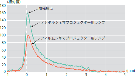 これらの改良により、高圧に耐えるランプが完成し、高輝度化が実現され、デジタルシネマプロジェクターが実用化されるにいたった。一例として、デジタルシネマプロジェクター用とフィルムシネマプロジェクター用の2kWランプの輝度分布を図8に示す。デジタルシネマプロジェクター用ランプでは、ほぼ同じ電力仕様のフィルムプロジェクター用ランプに比べて、1.6倍程度の輝度が実現できる設計がなされている。