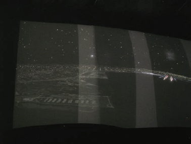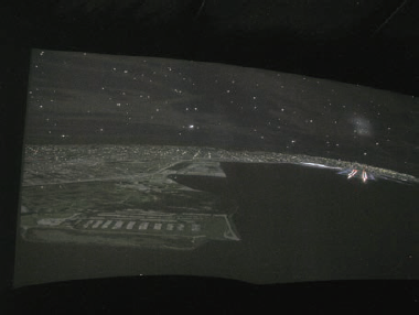 図1~5は、最近の導入例において、昼のシーンと夜のシーンのコンテンツが含まれるフライトシミュレーションに使用するコリメートディスプレイシステムのセットアップ時に撮影した写真である。これらの写真は加工されておらず、正しく見るためには高品質なモニターが必要になる可能性がある。