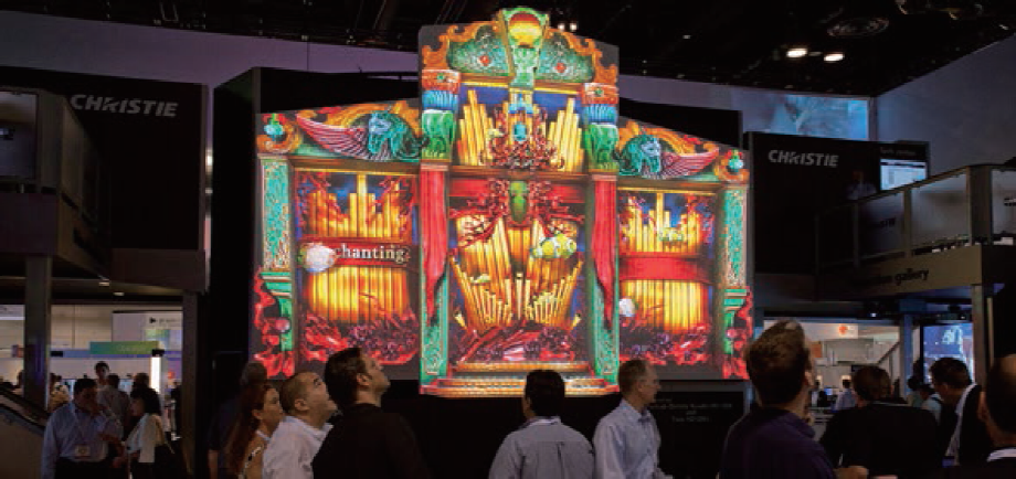 2011年6月にアメリカのフロリダ州オーランドで開催されたInfoComm2011のCDS展示ブース。世界的に有名なプロジェクションデザイナーBart Kuresa氏のデザインによる3Dプロジェクションマッピングが披露された。Christie Roadie HD+35Kをポートレートで使うなど、かなり実験的な試みであった。