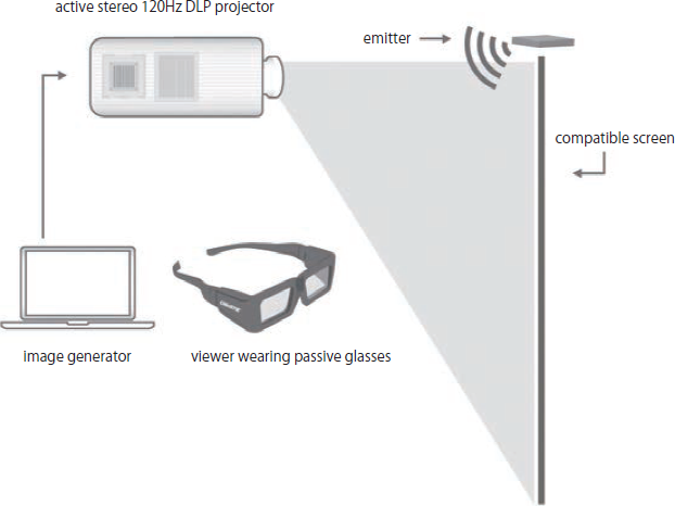 この方式は、まず、コンピュータなどで、映像ソース側から左右の視差を変えた「左目用」と「右目用」の映像を1秒間に96~120回の速度で、交互に3Dプロジェクターに送出し、3Dプロジェクター側も同じ速度で左右の映像をスクリーンに投影する。次に、プロジェクターから同期信号を受けた赤外線発光装置※1が特定の空間に赤外線を出し、この赤外線信号受信器を内蔵した3Dメガネ※2が、左右の映像が投影されるタイミングに同期を合わせて、メガネの左右の液晶を「ON/OFF(開閉)」にする。これにより、右目には右目だけの映像が、左目には左目だけの映像が見える仕組みとなる。