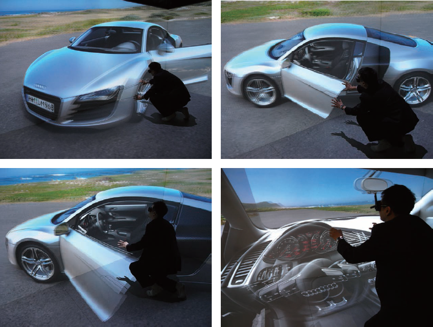 HoloStage®は、従来型のCAVEに比べてスクリーン面積が大きく、3Dプロジェクターも自社の最新型3D対応DLP®プロジェクターを採用した。ヘッドトラッキング装置も、精度の高い最新型製品を組み合わせることで、自動車や建物などの大型製品においても、多面空間の中に高精細で実寸表示ができるようにした。