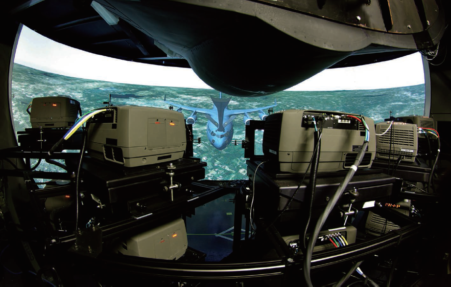 2) の場合、実際の現場とそん色のない「リアル感」が最重要視されるため、プロジェクターには「解像度」「色再現性」などが要求される。また、ドームスクリーンなど変形スクリーンに対して、複数台のプロジェクターで「シームレス」映像を投影することが要求される。