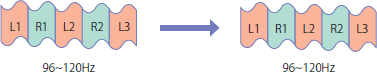 96~120Hzの左目、右目のフレームを交互に入力し、入力と同じ周波数(96~120Hz)で左目、右目と交互に出力する。