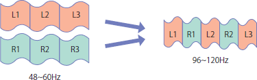 48~60Hzの周波数で左目のフレーム、右目のフレームを交互に入力し、このフレームを2倍の周波数(96~120Hz)で処理し、左目、右目と交互に出力するが、この時、入力フレームは2度使用される。