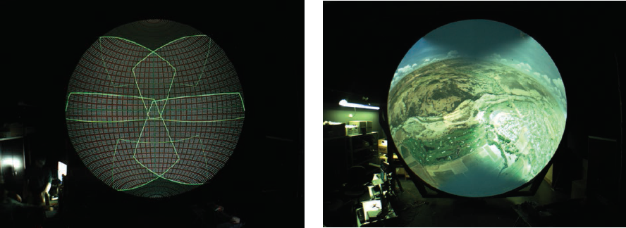 写真9. Christie AutoCal による補正中のテストパターン(左)と、 Christie AutoCalを使用した映像(右)