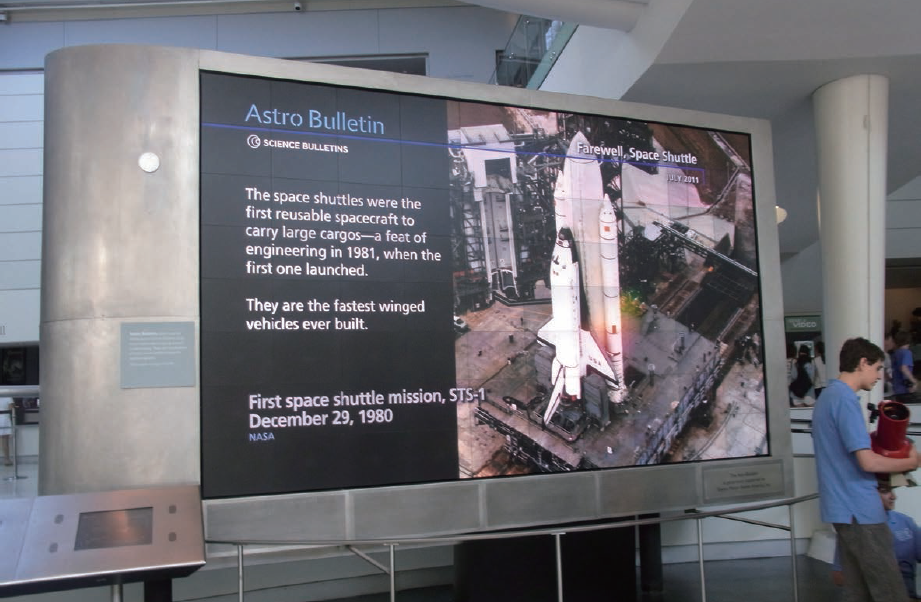 館内のスペースサイエンスコーナーにあり、ここでの特別展示情報や宇宙に関する様々なニュースなどが表示されている。周囲がガラス張りで日中は自然光がふんだんに入ってくるが、MicroTilesTMに映った映像の視認性にまったくは問題ない。来場者のアイキャッチに役立てられている。
