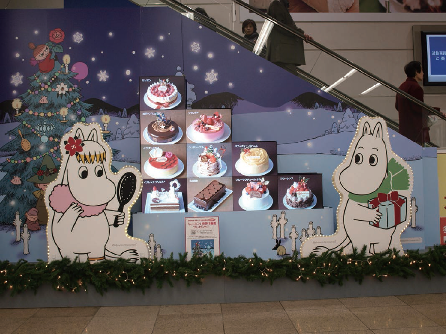 クリスマスフェアのキャラクターであるムーミンの絵のほか、クリスマスイルミネーション、クリスマスグッズ特設会場の案内などが表示され、通路を行き交う何万人もの人の目を楽しませた。