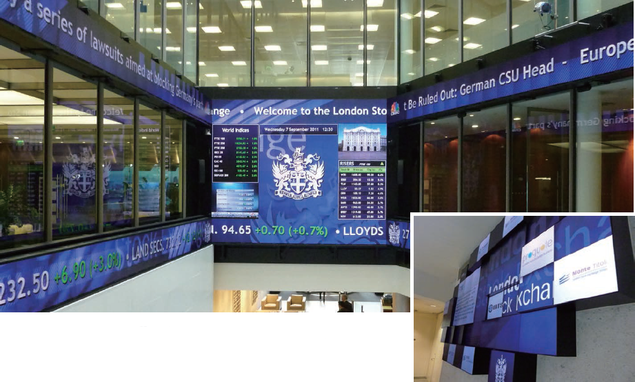 一例として、世界的に有名なロンドン証券取引所がある。MicroTilesTMは同所内のいくつもの場所で使用されている。メインロビーの上方では、アトリウムの内側がMicroTilesTMで囲まれている。ロビーには革新的なインフォメーションウォールがあり、MicroTilesTMは非常に興味深い形状で配置されているだけでなく、メインプレーンに段を付ける形となっていて、魅力的で目立つディスプレイを作り出している。