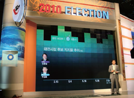 2010年のソウル市長選挙の選挙速報用表示ディスプレイとして使用された。「ディスプレイは四角いもの」という常識を覆した使用例として話題を呼んだ。