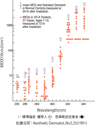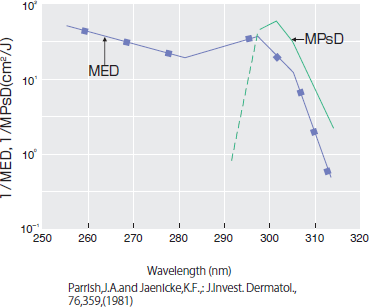 この様に300-310nmにかけて、皮膚を赤くする反応曲線が急激に立ち上がっている。つまり、300nm以下の短い波長は非常に効率よく、少ないエネルギーで皮膚を赤くする。この皮膚を赤くする波長は、発癌を誘導する波長と近似であることは既に報告がある1)。そのため、赤くさせずに治療をすることが、まず、発癌リスクを回避する意味で大前提になる2)。ここで、皮膚を赤くする最小のエネルギー量を最少紅斑量(MED、MinimalErythema Dose)と呼ぶ。