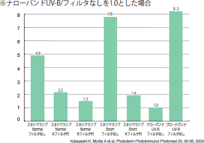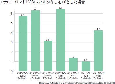 近年、ブロードバンドUV-BからナローバンドUV-Bを経て、エキシマランプによるエキシマ光へのシフトが進んでいるが、本結果からも明らかなように、エキシマランプをそのまま使用するのでなく、エキシマフィルタの採用が必要と考える。