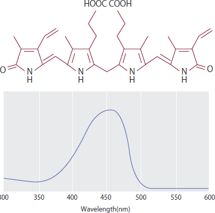 胎児は、母胎内では酸素を有効に使うために、赤血球を大量に必要とする。一方、新生児は、生後の環境において、酸素を十分に取り込むことができることから、余分な赤血球は破壊される。そのためにビリルビンが生じる。参考として、ビリルビンの分子構造と光吸収スペクトルを図1に示す2)。