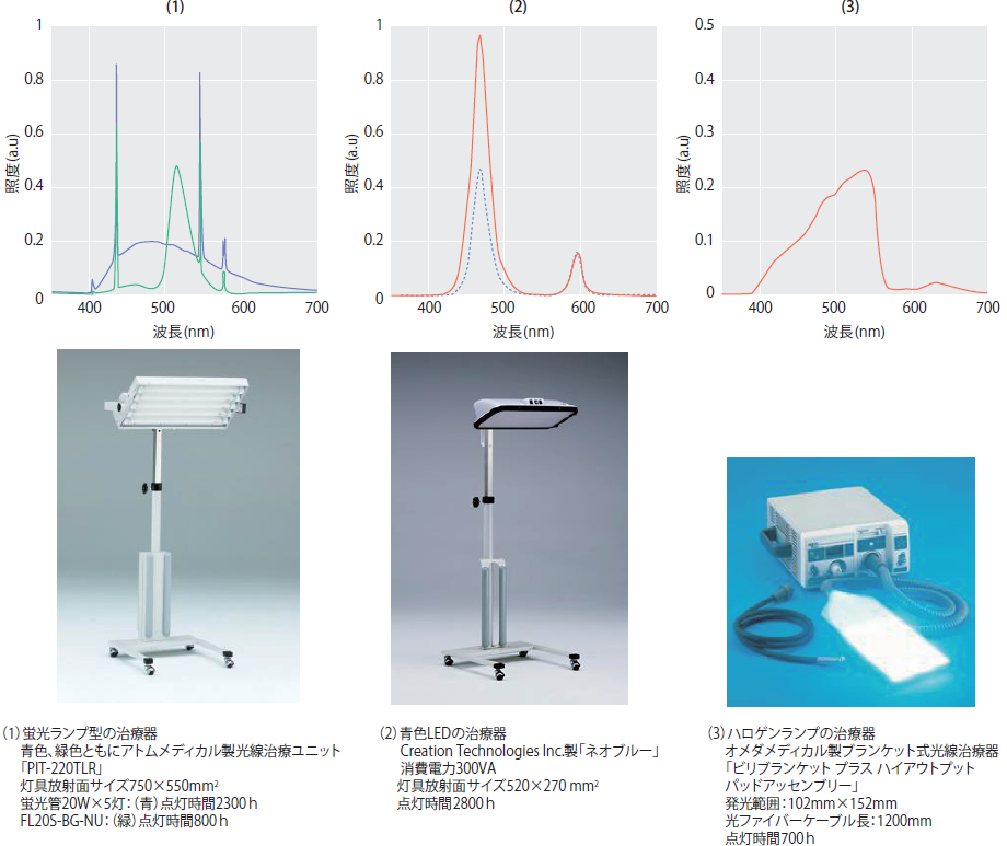 以下に、臨床治療現場で実際に使われている黄疸治療器のスペクトルを測定した例を記す。測定は、新生児が治療時に光を受ける状況を再現し、得られたスペクトルを相対照度として比較できるように工夫した。即ち、落射照射の際、受光部は灯具の発光面からの距離が30cmになるように設置し、照射面に正対させて中央を受光した。密着タイプの治療器の場合は、受光部を治療器に密着させて受光した。