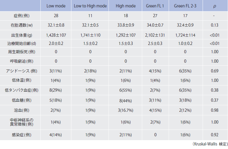 患者背景を表1に示す。出生体重および治療開始日齢にばらつきがみられた(Kruskal-Wallis検定;p<0.01)。しかし、核黄疸の危険因子については、有意差はなかった。