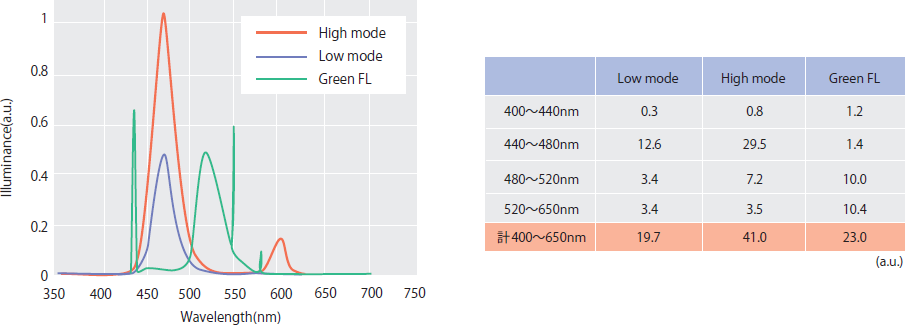 なお、スペクトル測定には、可視域の感度補正を行ったファイバー式のスペクトロメータHR4000CG-UV-NIR(Ocean Optics製)を使用し、照度測定誤差±14%、波長分解能は1.6nmの条件で行った。
