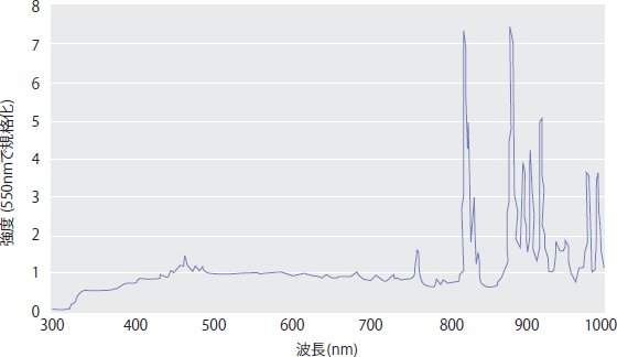 病変部分の凹凸、表面模様などの形状や色調の微妙な変化を読み取ることから、演色性に優れた光(自然光に似た光)が求められる。そのために光源としては、擬似太陽光ランプといわれるキセノンランプ が 使 用される。このランプは、400~700nmに渡って太陽光に近いブロードな波長分布(図2参照)を持つ。このことから、特定波長を使用したい場合も、任意に波長選択ができる。