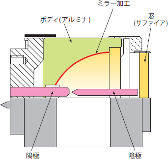 光を取り出す窓には、アルミナの単結晶であるサファイアを使用している。陰極は、それを支えるモリブデン板に接続されており、モリブデン板は同じく口金(-側)につながるフランジへと接続されている。陽極は、口金(+側)となるベースに接合されている。電流導入端子には冷却のためのヒートシンクを装着し、導電は、このヒートシンクを介してなされる。