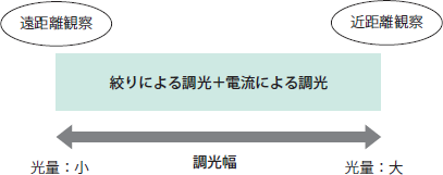 近点観察と遠点観察では、必要な明るさは異なる。そのため調光の必要がある。調光幅は絞りによる調光と電流による調光を組み合わせることで、大きくすることができる。(図4参照)