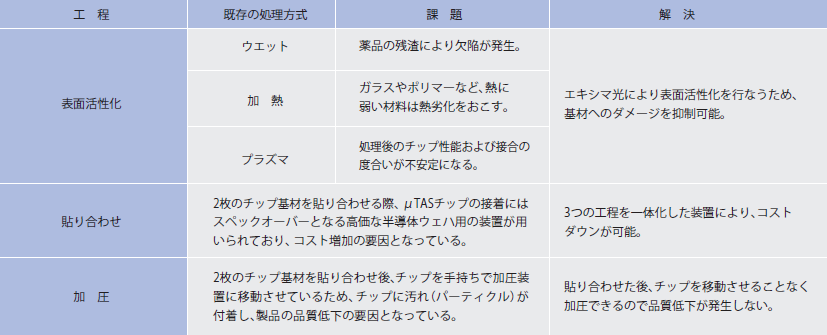 (172nm Xeエキシマ光を用いて、加熱レス、接着剤レスでμTASチップの製作が可能→他用途のように数百度まで加熱しないので、被照射物に対してダメージレス(少ない)となり、被照射物の可能性が広がる) - ・ オールインワン/イージーオペレーション