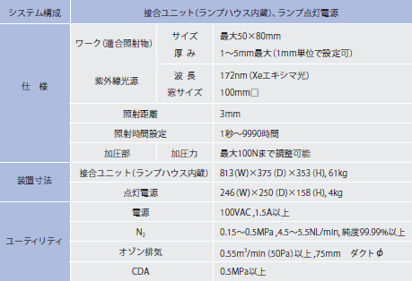 本装置にはランプハウスが内蔵され、172nm Xeエキシマランプが採用されている(表2)。以下に、172nmXeエキシマ光とその応用事例について説明する。