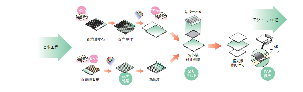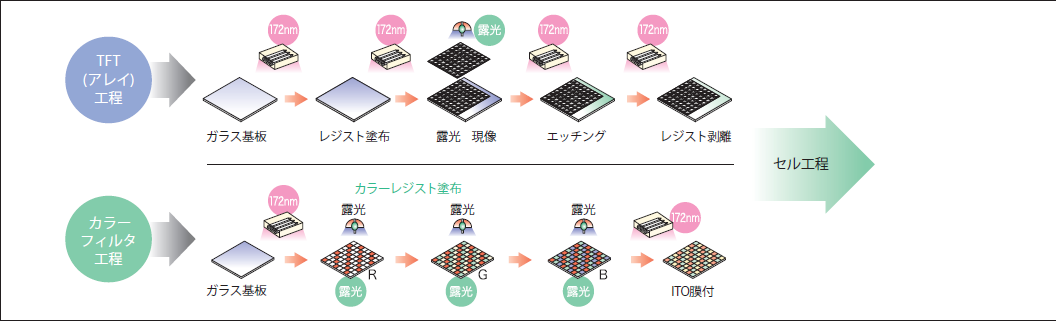 図3.LCD製造プロセスと172nmXeエキシマ光の導入箇所