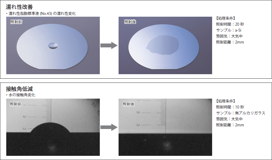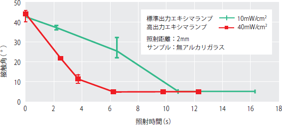 LCD製造では、基板洗浄の目標値として、純水接触角10°以下が一般的な目標値となることが多い「。高出力タイプ」では、図4に記す条件下において、照射時間5秒以下で純水接触角10°以下を実現できる。図5に、純水の接触角変化を示す。
