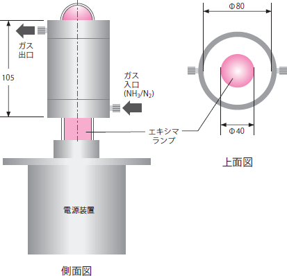 図2にVUV励起反応管の構造を示す。電源装置の上部に、172nmのVUVを放射するエキシマランプ(外径40mm、ウシオ電機製)を設置し、ランプにアルミ製円筒カバーを同軸で配置し、ランプ表面とカバー内面の間をNH3/N2の混合ガスが流れるようにした。混合ガスが流れる空間の容積は377cm3で、NH3/N2の流量が0.3L/minの時、VUV励起反応管内の混合ガスの滞留時間t gは75.4秒となる。172nmのVUVの出力はランプ表面で26mW/cm2である。