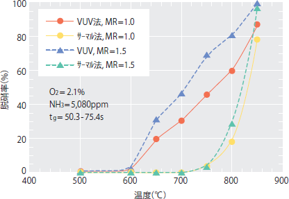 図3. 従来型SNCR法(サーマル法)と励起アンモニアSNCR法(VUV法)の脱硝率比較(NH3/NOモル比(MRs)1.0および1.5、酸素濃度2.1%、NH3濃度5,080ppm)